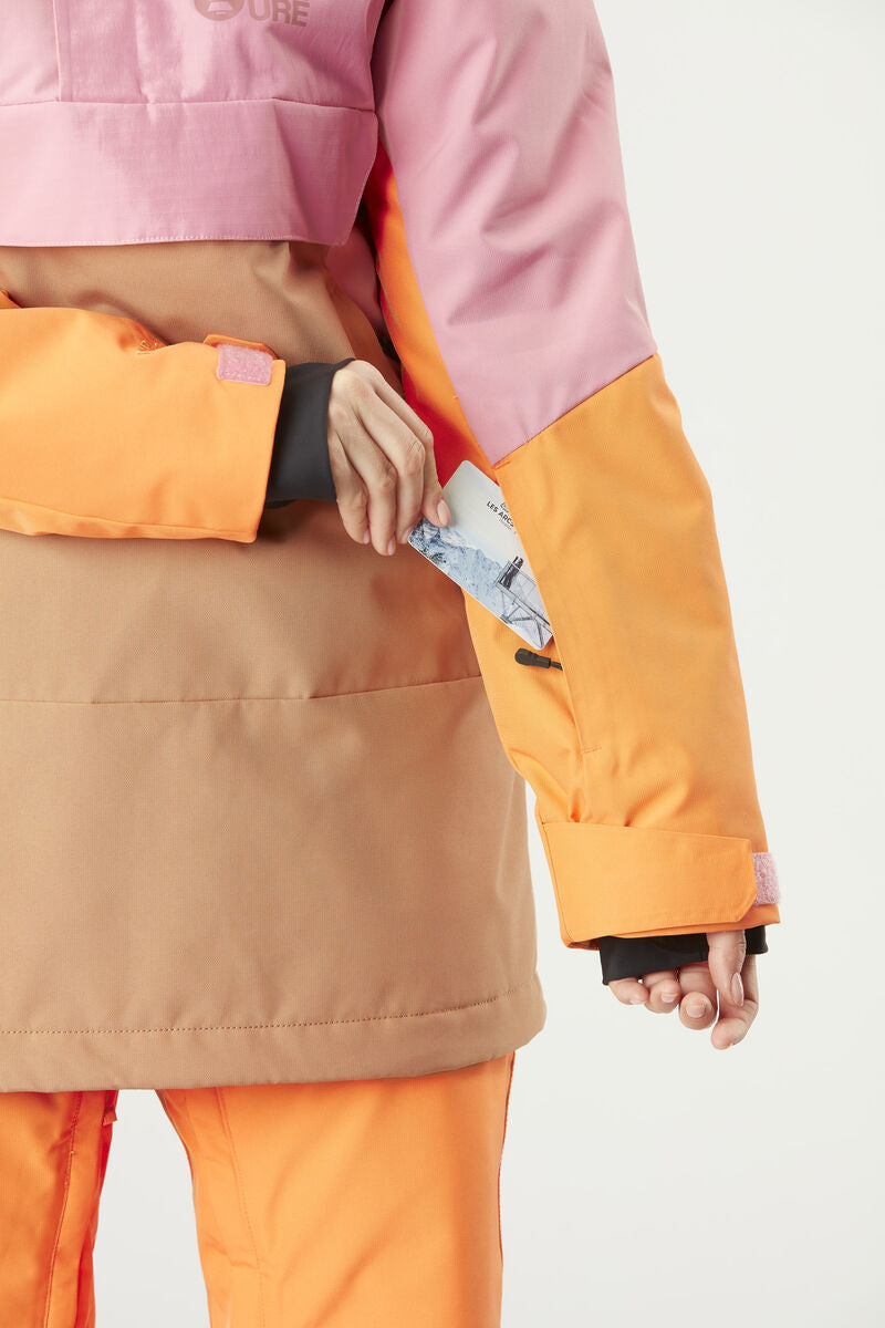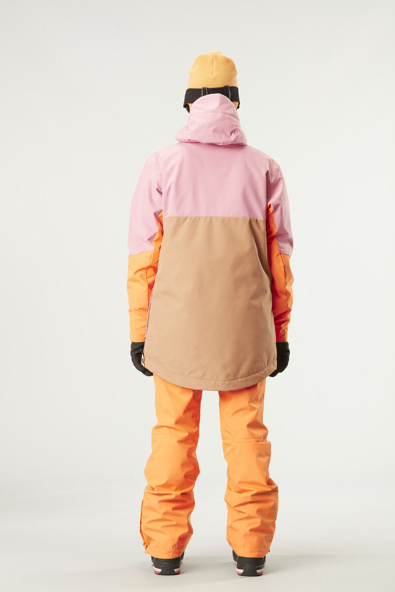 The 2-layer Oroya Jacket is a warm jacket that offers incredible comfort whenever you ride. Made with a sustainable recycled polyester face fabric, it features a 10K/10K membrane for reliable waterproof breathability, reinforced with a PFC-free durable water repellent treatment. Designed for optimal warmth and comfort, the pit zips offer additional ventilation for long days in bounds. For enhanced protection and fit, the hood, cuffs, and hem are all adjustable, while the insulation ensures all-day warmth. Cut for a long-back fit, with a square-quilted style, this warm jacket works well for the coldest days at the ski area as well as on winter outings in town afterwards.
